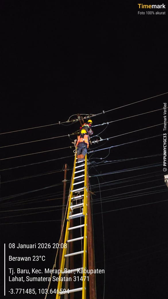 Lahat, lahatsatu.id – Jum’at dini hari, 09 Januari 2026, wilayah Kabupaten Lahat dilanda hujan dengan intensitas yang tinggi. Curah hujan yang tinggi tersebut sebabkan beberapa gangguan jaringan listrik.Beberapa wilayah yang terdampak akibat gangguan jaringan listrik diantaranya Merapi Barat, Merapi Selatan, Kebur, Telatang, Bandar Agung dan SP 6. Dengan cepat PLN ULP Lembayung merespon kejadian tersebut, mengerahkan personil untuk memulihkan kondisi kelistrikan